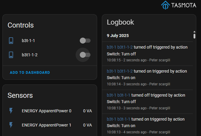 Ok, all done – and I checked that the relays click properly. I should say that the webUI is generally considered to be a developers tool (though I use it sometimes when playing with boards). Let’s go see if Home Assistant has picked up on this device (most likely as I set up MQTT in the configuration section).