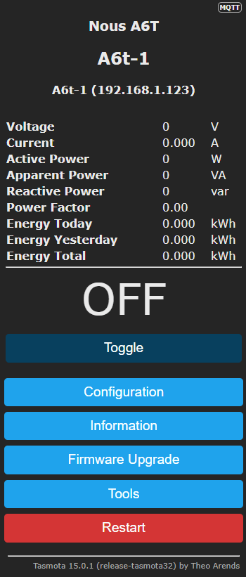 Parameters as with previous Tasmota devices – firmware update – because I can – from v14 to v15. The button light turns green when press ON or turned on from the webUI, nothing when OFF.
