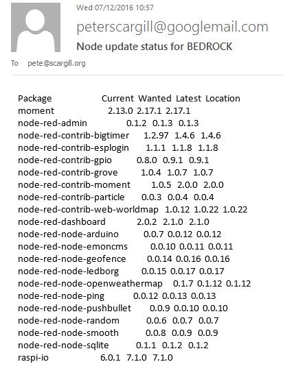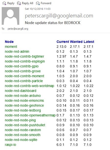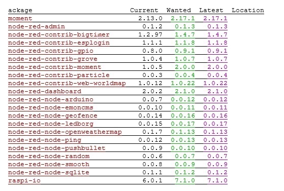 then load in a browser http://your-raspy-ip/outdated.html and take a look… this can be used to have a page instead of an email, just on the raspy itself… and script can be scheduled to run once a day, for example… first line parses .node-red folder, the second line parses global nodes