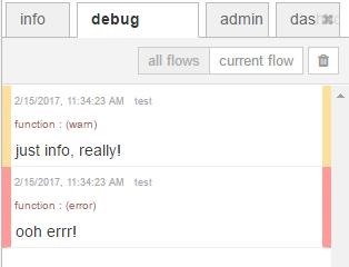 Isn’t that handy – the only difference here being the colour – yellow for warning (I’d have used blue but hey ho) and red for error. Using this instead of a debug node could save a little real estate on the screen in some cases.