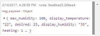 In this case – the content of the injector is irrelevant. Just drag it onto the screen. Here we have (for the sake of it) two debug nodes – one is looking for msg.payload.actual and the other is looking for msg.payload.desired.
