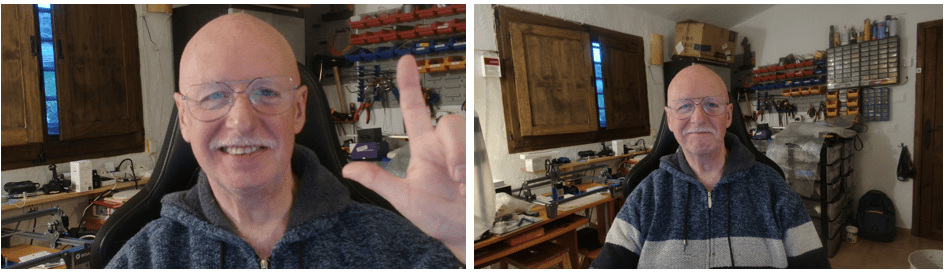As it’s early in the morning I simply went off to put on some warm clothing (mid-April – Southern Spain – it’s supposed to be toasty warm – but not today – In my original blog on the Obsbot Tiny – the weather was much nicer – way too cold for that t-shirt right now) and as I came back into the office, the new Obsbot was tracking me effortlessly around the room – I’d not set ANYTHING UP, no proper lighting – nothing …. it just worked. The two shots above were implemented simply by sticking my hand in the air with my index finger up at which point the Obsbot smoothly zoomed in and out. I like this. As for head tracking, this next snap below is taken from a completely different angle – the camera just automatically moved around to follow me.