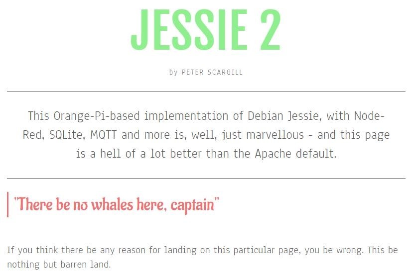 February 2016: I took the latest Debian Jessie and scripts and after bringing everything as up to date as possible, I began my umpteenth attempt to get a working Orange Pi. This time I got reliable operation of Node-Red, Apache, Webmin and MQTT.