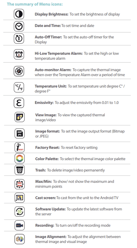 Where the IR0005 came with a tiny 4GB SD card, the new model IR281 is fitted with an easily replaceable 32GB microSD (handy for recording IR video). The unit has an extensive and easy-to-use menu including high and low temperature alarms, a choice of degrees C or degrees F, emissivity setting and more. See the full list further down.