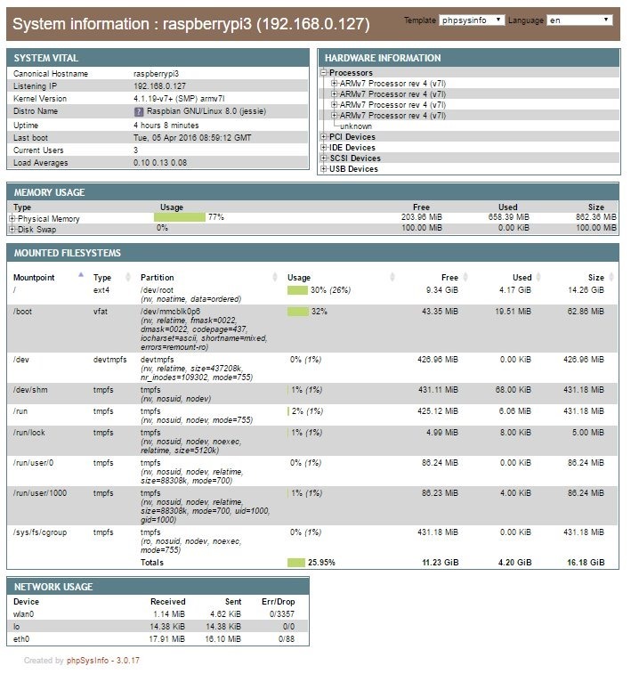 Just to save anyone getting caught out with out of date information, if you want to install phpsysinfo on your Raspberry Pi 2 or 3 running Jessie… the picture below is self-explanatory – simple to install and some worthwhile info. RPI-Monitor is another useful monitoring tool.