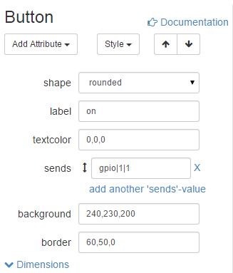 On the right you’ll see a typical button setup.. when you press the button it sends “gpio|1|1” out via TCP to the Pi2, which then needs to send nothing more than a new line for acknowledgement. The text and the format is entirely arbitrary. Since I discovered the SPLIT function in JavaScript I figured this was the way to go, sending vertical line delimited arguments. I have also done RGB control but to keep things simple I’ll not discuss that here.