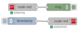 I put the two long numbers into one of the nodes – and that’s it. Sending a timestamp or simply “hello” payload to the lower PubNub node results in the message appearing instantly on the upper node and going out to debug on my screen. You don’t get any simpler.