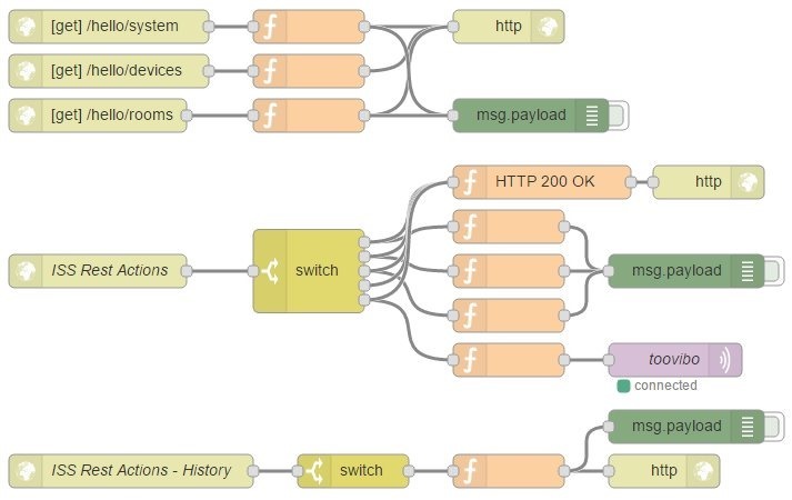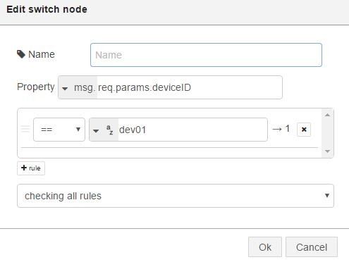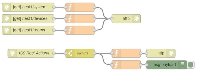 [{“id”:”760ef358.89f10c”,”type”:”http in”,”z”:”85e92205.7a16e”,”name”:””,”url”:”/test1/devices/:deviceID/action/:actionName”,”method”:”get”,”swaggerDoc”:””,”x”:268,”y”:635,”wires”:[[“b1879507.4e7868”]]},{“id”:”b1879507.4e7868″,”type”:”switch”,”z”:”85e92205.7a16e”,”name”:””,”property”:”req.params.deviceID”,”propertyType”:”msg”,”rules”:[{“t”:”eq”,”v”:”dev02″,”vt”:”str”}],”checkall”:”true”,”outputs”:1,”x”:519,”y”:672,”wires”:[[“a94732b4.56b8d”,”bb4a9412.44b568″]]},{“id”:”bb4a9412.44b568″,”type”:”function”,”z”:”85e92205.7a16e”,”name”:””,”func”:”msg.payload = \”Scene loaded\”;\nreturn msg;”,”outputs”:1,”noerr”:0,”x”:679,”y”:712,”wires”:[[“3dd59244.c22a6e”]]},{“id”:”3dd59244.c22a6e”,”type”:”debug”,”z”:”85e92205.7a16e”,”name”:””,”active”:true,”console”:”false”,”complete”:”payload”,”x”:836,”y”:763,”wires”:[]},{“id”:”5a3f178f.a5c0e8″,”type”:”http response”,”z”:”85e92205.7a16e”,”name”:””,”x”:799,”y”:672,”wires”:[]},{“id”:”a94732b4.56b8d”,”type”:”function”,”z”:”85e92205.7a16e”,”name”:””,”func”:”msg.payload = { \”success\”: true, \”errormsg\”: \”ok\” };\nreturn msg;”,”outputs”:1,”noerr”:0,”x”:679,”y”:672,”wires”:[[“5a3f178f.a5c0e8”]]}]