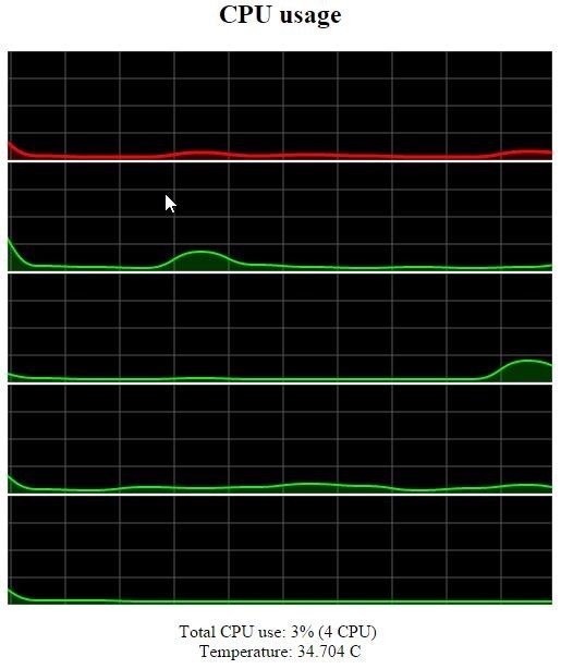 And the result – this baby. This is a tiny piece of software that runs on the Pi and is DEAD easy to install – and on an otherwise unused port, on any browser gives you a more or less real time graph of the 4 cores of the board in action, providing instant feedback as to the health of your Raspberry Pi and how much load it is under. Marvellous.