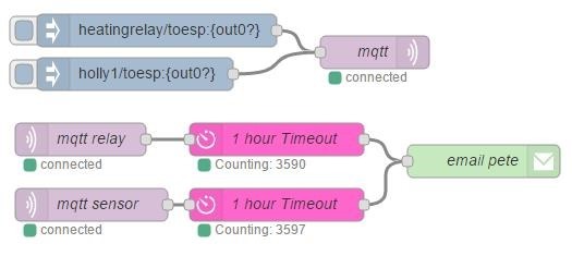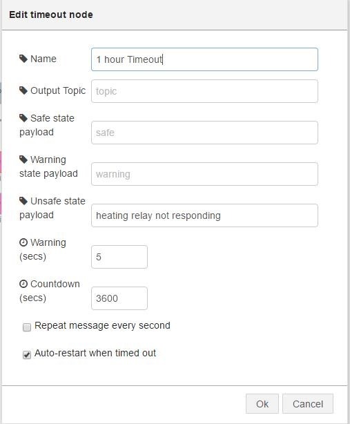 During that time, normally, the MQTT nodes would have responded every 5 minutes – ie 20 times, topping the timeout node up to 3600 seconds even if most of the messages were missing (and there is no reason why any should be missing). In this case I’ve not put messages for “safe state” or “warning” – so nothing goes out unless the timeout actually runs down to zero.