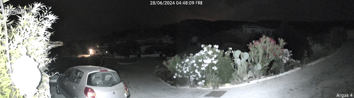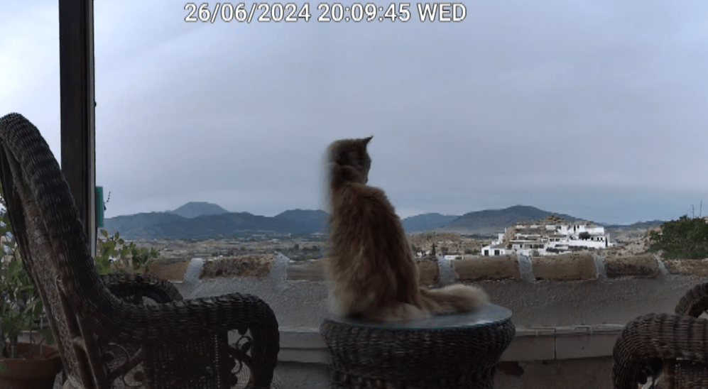 Ok, so I put the camera outside where it’s meant to be – the twin lens line-up does not (out of the box) do well closeup inside for lense alignment, either on the PC or phone. But with reasonable distance it’s just fine. In the process I noted the THREE blindingly bright LEDS were set to ON (movement sensitive) by default. Sorry I can’t show you our wonderful scenery that well, because after a VERY hot, clear Southern Spanish June day, the weather has suddenly gone to pot as you’ll see in the image below. Just as well the internal battery arrived somewhat charged though I later realised I could have just used a USB supply to power the Argus 4.