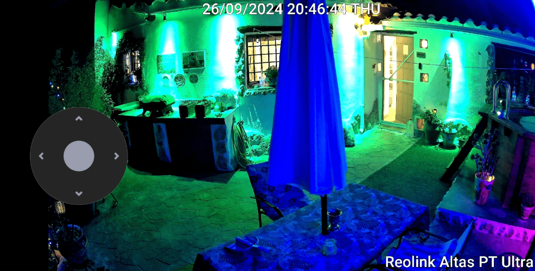 And finally – “the day after”… in the early hours my wife told me the camera spotlight had been on and off all night – turns out that by default, sensitivity was set near maximum – and note the white umbrella flapping all over the place – below – well, it did that all night far more wildly than I’ve captured here – not my best positional planning… despite all that, the battery still showed 62% first thing. I’ll get a band around that….