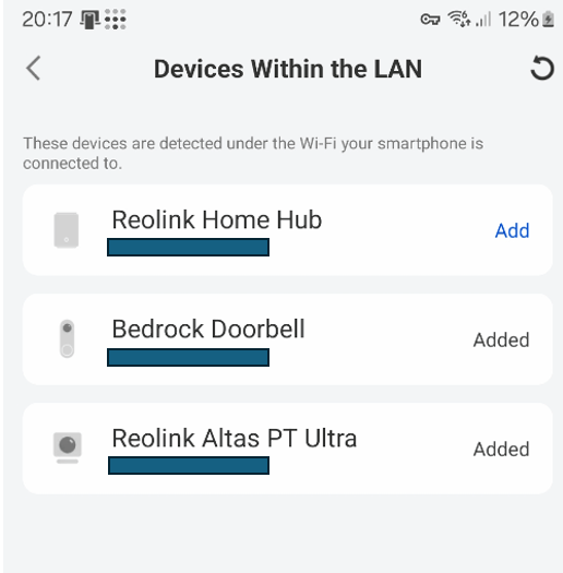 And so, with the box opened up, a single handy 256GB microSD inserted into the lower SD socket, Ethernet and power connected – I’m pondering what’s next. Given a choice of adding devices in the Reolink APP by QRCode manually or by LAN, I chose LAN and you see the result below – easy enough…