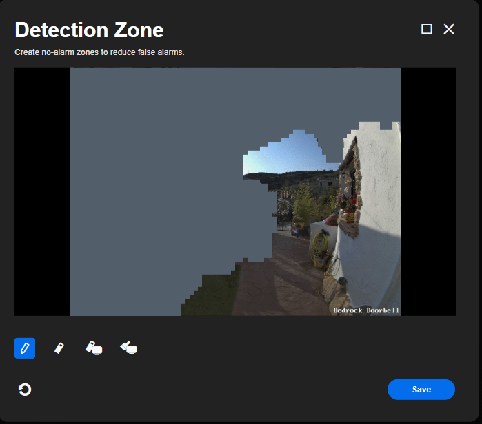 If anything, I found the motion detection a bit TOO sensitive to irrelevant change but I’m still working on it. Here is our cavehome (no, really) entrance – and below you’ll see I had to block out much of the available sensor area as we have a large plant on the left then a fly screen (around an outdoor table) which constantly flaps about in the wind, not to mention the rather powerful summer sunrise all of which tend to trigger my camera and doorbell recordings. Moths seem to take great delight in hovering close up to cameras at night.