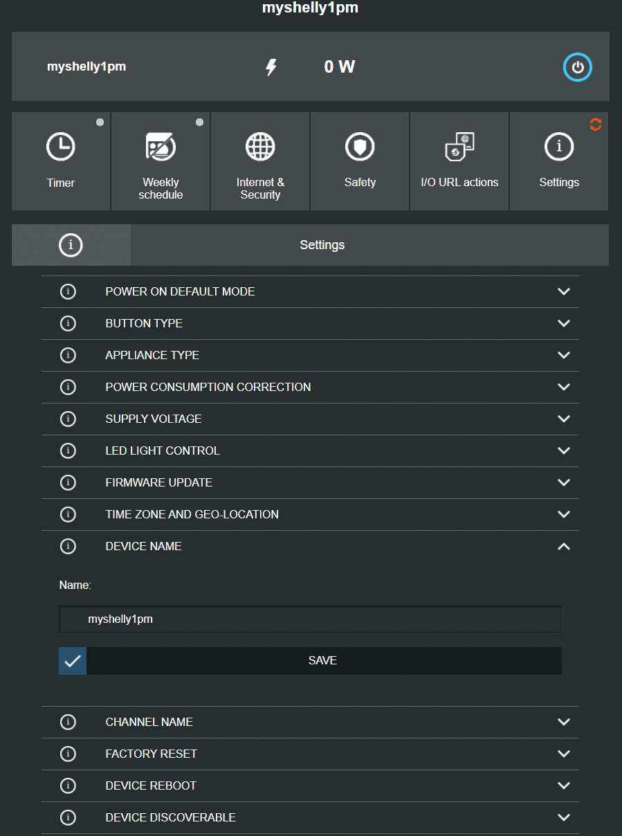 Shelly can be configured to be OFF at power-up or ON at power-up – and SO much more. By default, Shelly 1PM will shut off when the power reaches 3500W. You can set that to any lower value you like – seems sensible.