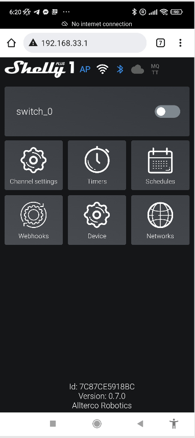I’ll do some power 240v testing soon. Meanwhile note that you can set a timer (timeout) and also set up schedules. Web hooks didn’t do anything, presumably as I’ve not connected to the Shelly Cloud. Under INTERNET you can set WiFi 1, WiFi 2, Access point, Cloud, Bluetooth and MQTT connections – what more could we need…