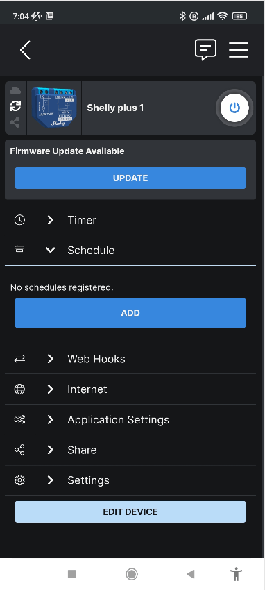 As always I like to be up to date, the firmware on the device wsa 0.7.0 and the latest available was 0.9.3 – it’s only polite to be up to date. This seemed to take no time at all but I still seemed to be on the earlier version. So – as with the Plus 1 – I rebooted the phone (note, not the device, just the phone). The Shelly knew my loction or at least the UK capitol – so I adjusted the coordinates to my home here in the Northeast of England – just because I could.