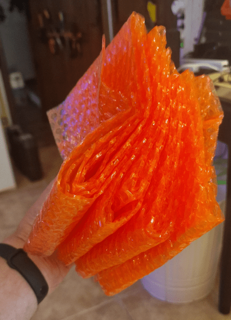 When this package arrived I noted the usual grey thin plastic waterproof envelope – and inside – a shed-load of pink bubble-wrap – all held together with thin strips of cling-film, making the packaging material almost 100% re-useable – good start.