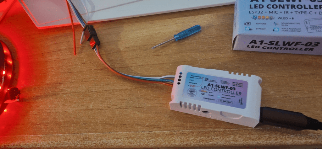 Ok, USB-C and DC connector inputs, persumably works with Home Assistant (obviously as HA has a WLED integration) and of course it’s own WLED web page. The unit comes complete with sticky pads, a tiny Allen-key and a screwdriver – no assumptions made here – everything you need except RGB LEDS – but they also supply select RGB LEDs and sent me a reel to play with.
