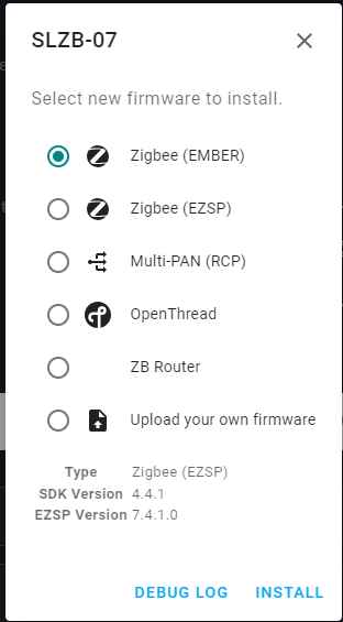 Moments later (no unplugging needed) I went back in to look at the CHANGE FIRMWARE option. I was presented with a list. See on the right “ZB Router”. As I don’t need another coordinator – I’m confident the SNZB-06 Ethernet coordinator unit is working fine and so I clicked on the ZB Router option for the SNZB-07. DONE.