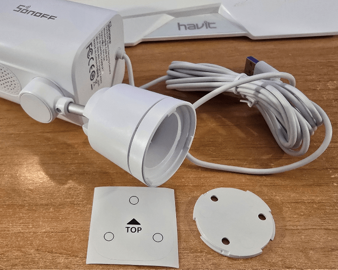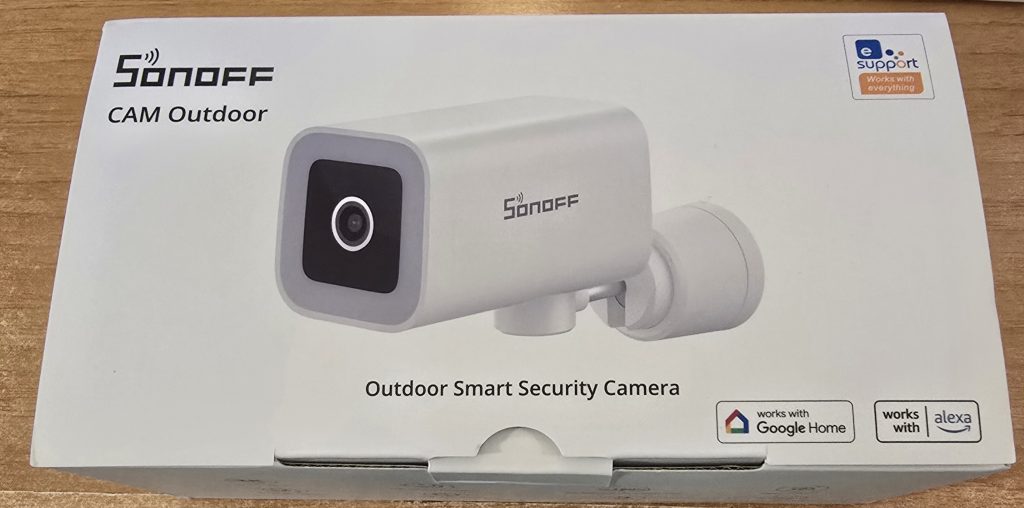 This is the first of my post-holiday blog entries – nice to be back from the USA and at my desk. Model number? CAM-B1P. This new external WiFi camera from Sonoff comes with a built-in (approx 3m) lead with a USB-A plug at the end. At first glance at least, nothing special in the spec… manual vertical tilt?? The unit has the strangest-looking mounting piece I’ve ever seen but which in the end looks quite practical and is simple to use.