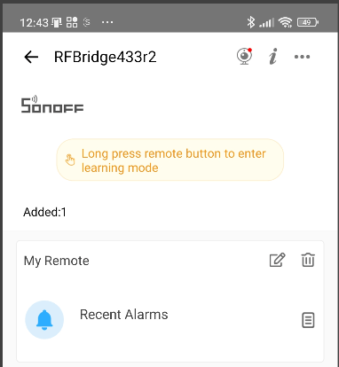 I clicked inside the device block and saw “No remote yet” and “Add”. I clicked “Add” and sure enough the door sensor appeared along with a message to “long press remote button to enter learning mode”. I noted at this point, every time I separated the DW2 and magnet, the “recent alarms” message updated the time.
