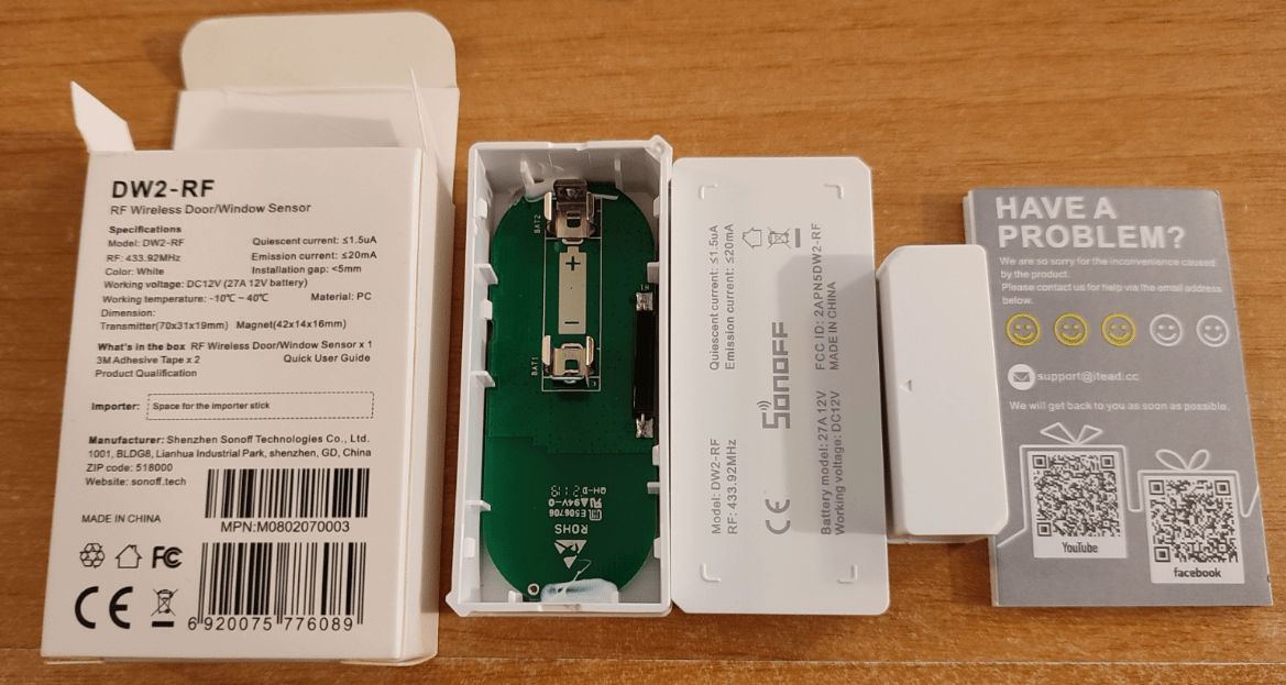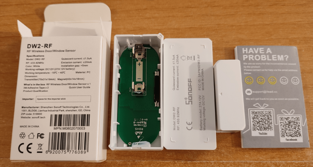 Next: the other items I received in the package – the Sonoff RFBridge(R2) and their DW2-RF which differs from the WiFi version in using only 1.5uA quiescent current but uses a tiny 12v battery instead of the pair of AAAs that the WiFi model uses.