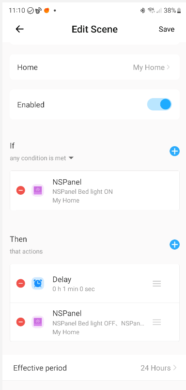 Well, I got onto my contact at Sonoff who initially doubted if they’d be able to fix that but then came back to me within the day – there is another way. Instead of setting a timer in the APP, create a SCENE within the APP (main home page, not the NSPANEL page). I made a scene with an IF condition – i.e. IF the first output is ON, then delay X minutes, then turn it off. Ok, not quite as obvious as setting a repeat timer – but still simple and it works. Ok, I set it to one minute just to test easily.