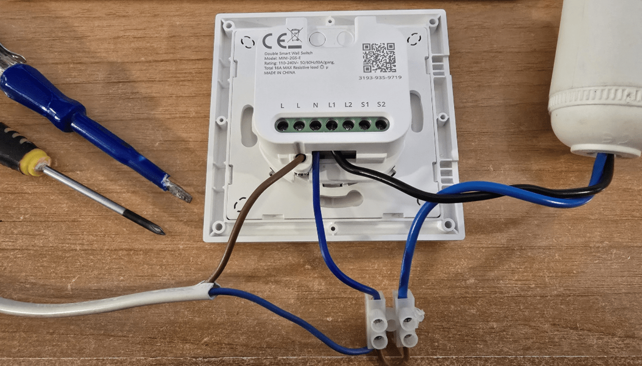 Common neutral using (in this case) choc-block – the incoming live on the switch uses for reasons known best to Sonoff – a different connection type to the rest of the connectors – S1 and S2 are the switch connections which return to live inside the switch and here we need not think about those connections or the spare L connection. L1 is for a first lamp/load, L2 (unused here) is for the second. The Sonoff switch packaging like all of their products comes complete with multi-lingual instructions backed up by web versions.