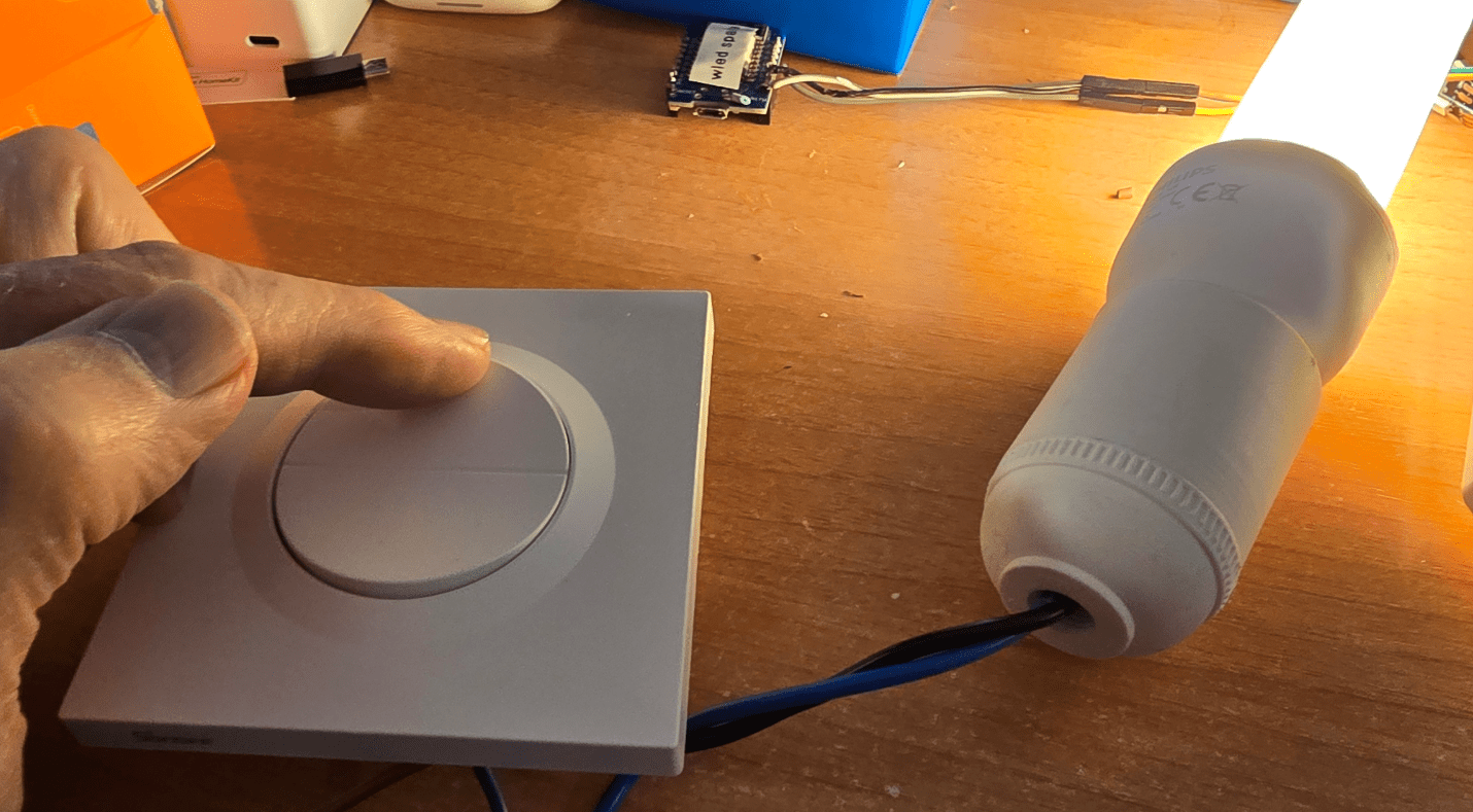 For now, a working WiFi wall switch. the top half of the button toggles the first output, the bottom half toggles the second output – quite a solid feel.