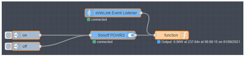 At the end here I’ll briefly show you two of the node-red-contrib-ewelink nodes running with this device. This was SO easy.
