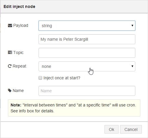 In the example above (that red block is NOT the Ivona node – it is a subflow I wrote – more in a minute)… let me show you those two INJECTS on the left..