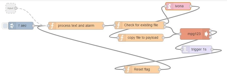 The yellow’ish blocks are user functions, the red block is a Node-Red EXEC functions – the purple item is a simple 1 second delay for good measure. The purple item is the node-red-contrib-ivona node.