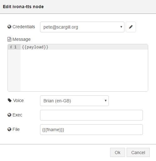 The MPG123 EXEC node calls mpg123 and passes the file name as parameter. The DELETE node simply deletes the file that Ivona creates… Here’s the Ivona setup. Put your credentials in the top box.