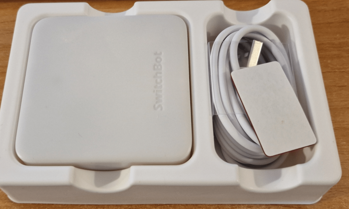 I took the new HUB 2 (above) out of the box, plugged it into a handy micro-USB supply, turned it on and remembered instructions I’d heard about removing the MK 1 hub before adding the new one to the Switchbot APP (on my phone) I checked to see if my phone already had Switchbot kit hooked into the APP – before remembering I have a new phone since I last used Switchbot. Just a plain box but it replaces IR controls as wewll as acting as a hub for Switchbot devices. Well, I don’t have any IR remotes to probram from… so I went back to one of my BUB2 devices you see below-right.