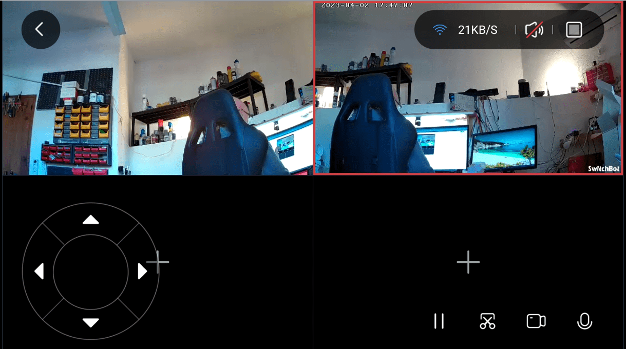 With 2 cameras connected and a spot of pan control you can see below that we’re looking at 2 different cameras – the APP of course gives you a variety of ways to view the cameras. Also on one camera I have the logo and time turned off, on the other they are turned on.