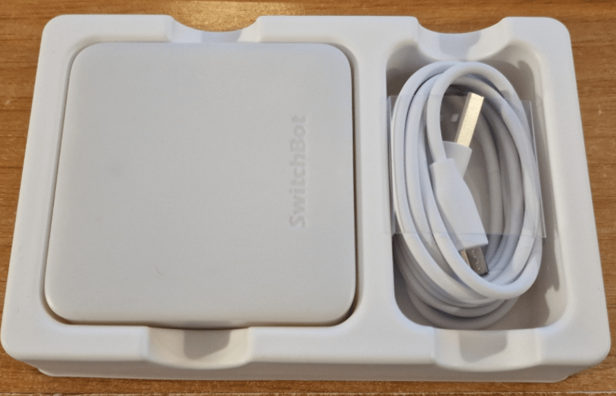 Hmm, Switchbot just sent me the Hub Mini – nice enough, simple box with recessed microUSB connector – comes complete with power supply.