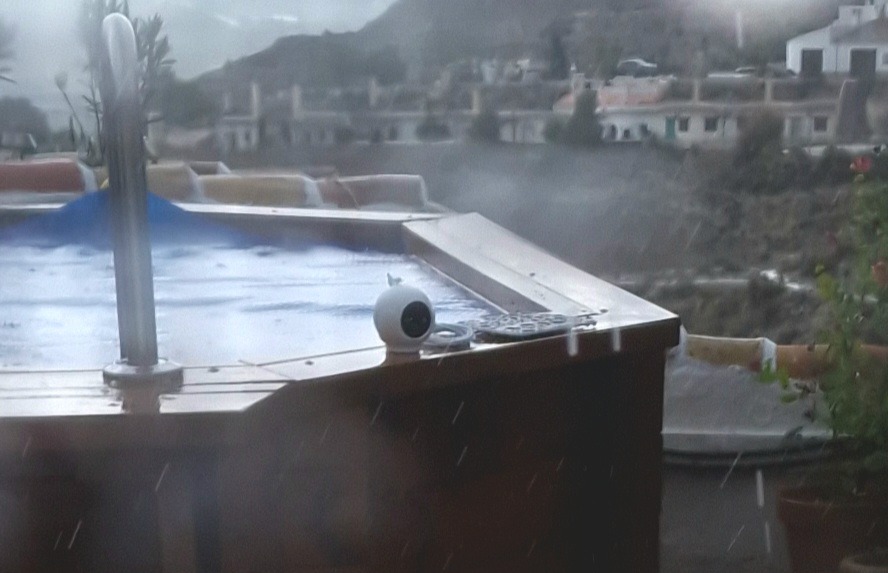 Both cameras are sitting outside right now, perched on our above-ground pool here in normal-sunny Spain, one facing in toward the house, the other facing the valley and distant mountains – and are they getting a beating? Yes. One has had a solar panel attached for a couple of days (mainly in the rain with little sign of any sun), the other got a quick solar charge before the heavens opened. So instead of the usual posed ideal photos…..