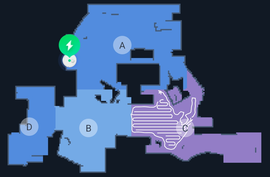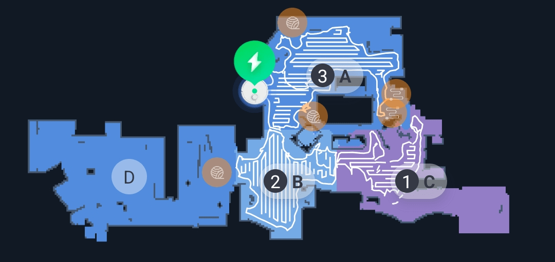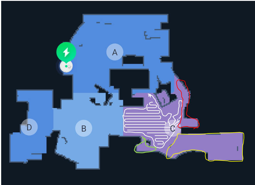 In the coming photos you’ll see the area has been split up into “rooms” by Robbie, marked as A to D. I didn’t do any of this – the vacuum did – when “mapping”.