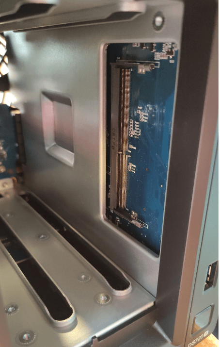 To the right you see the internal, side-fitted connector for optional extra RAM. It won’t take me long to get the urge to expand the unit by filling up the two M.2 sockets and the single RAM socket (2GB pre-fitted)… but the only way to see how this manages compared to my very old (but absolutely fine) DS214+ is not yet to go overboard.