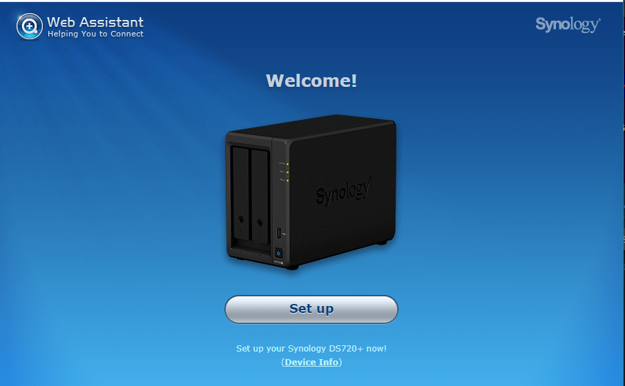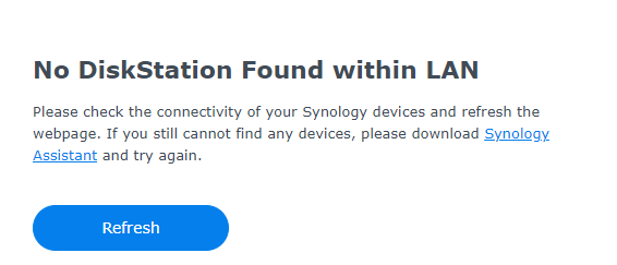 I went to https://find.synology.com in my PC web browser. Result? Gutted – nothing. I used the available link to get the “Synology Assistant”. Still no luck. I tried the second network connector – still nothing. At this point – the two front panel disk LEDs were solid green and the STATUS LED was flashing yellow. Time to do more reading up.