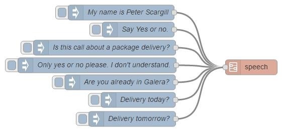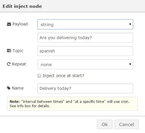 So first things first – this is is an example of what I started running on my Raspberry Pi 2… this particular bunch or injects just sit on the Node-Red desktop and can be accessed at the press of a button. The purpose of this, for someone living in Spain but not having a clue what to say to anyone ringing me up in Spanish to inform me of a delivery, is to give me a starting point at talking to them.