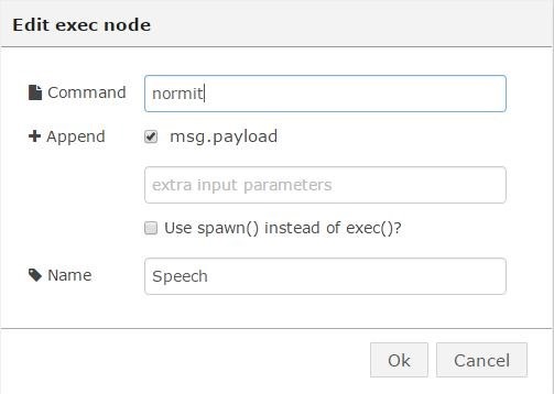 So now if you pass a message such as en en ‘hello there’ –t in your msg.payload to this node via, say an inject node – you’ll get speech. EASY!! And thanks to the Node-Red guys for pointing this out to me. Don’t try “spawn” mode and don’t worry it won’t hold up Node-Red – I can prove that by sending 2 messages quickly – it will play two at once (I’ve a fix for that lower down). Ignore the outputs of the EXEC node, you don’t need them.