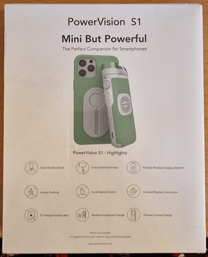 The PowerVision S1 is a “smart” 3-axis smartphone stabiliser with wireless power bank and “PowerFollow” tracking. See the February 2023 through to May 2025 updates at the end of this article.The device and its website are now defunct.