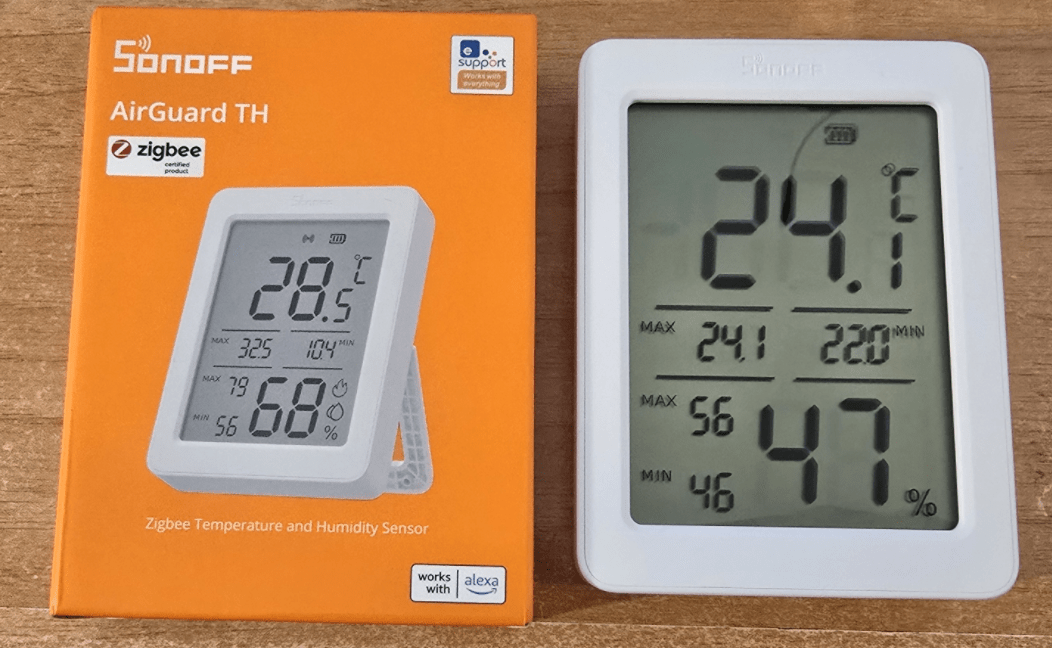This should be an easy one- the new Sonoff AirGuard TH is a Zigbee desktop LCD Temperature and Humidity Sensor – decent size – showing maximum and minimum values as well as current values.