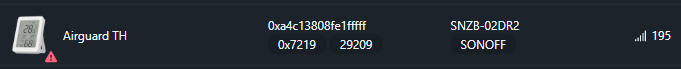 Not 100% sure about that red exclamation mark below Airguard TH (my name) – probably an update warning as it went away next time I took notice). But voltage, battery percentage, temperature and humidity are all exposed along with settings for degrees C versus degrees F etc.