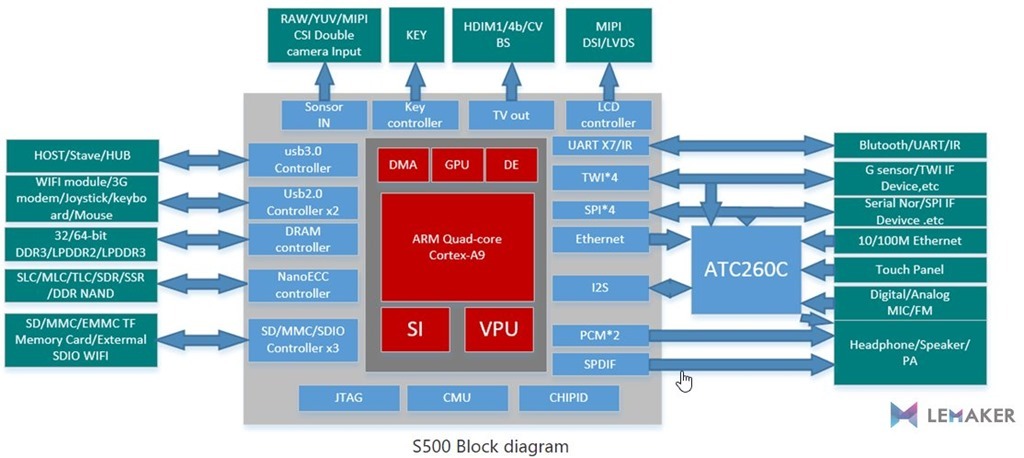 - Actions S500 Soc with integrated quad-core ARM Cortext A9R4 CPU and Imagination PowerVR SGX544 3D GPU