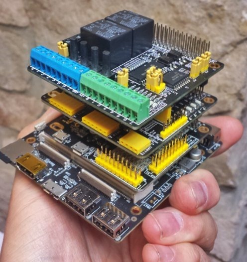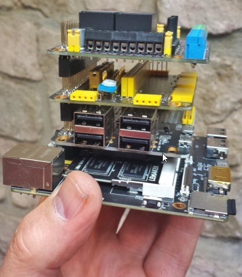 The pack also came with some peripheral boards, one of which provides even more I/O lines and 4more USB 2.0 connectors (for a total of 6 USB 2.0 connectors). The boards are stackable so you can just keep going. The next peripheral board provides 2 10a relay outputs,8 LEDs and even more outputs. A third board provides I2C connector, 2 UARTS and 2 SPI connectors along with a connector for an LCD1602 and more GPIO. All in all there’s something for everyone in this system “kit”.