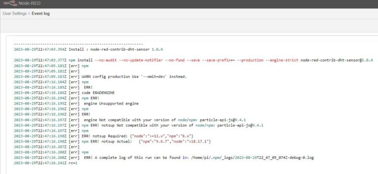 I’m up early on Sunday morning, running The Script on a virgin Raspberry Pi 4 which has installed the latest Bullseye from Raspberry Pi – no issues up to now and the script has just finished running. Temperature at completion was 42c on the fanless RPI4 and it seems that NodeJS 16.91 and NPM 8.19.3 were installed. Before running The Script, as user Pi, I did the normal sudo apt update and sudo apt upgrade at the command line on this headless installation. I just checked and Node-Red is running by default – white background.