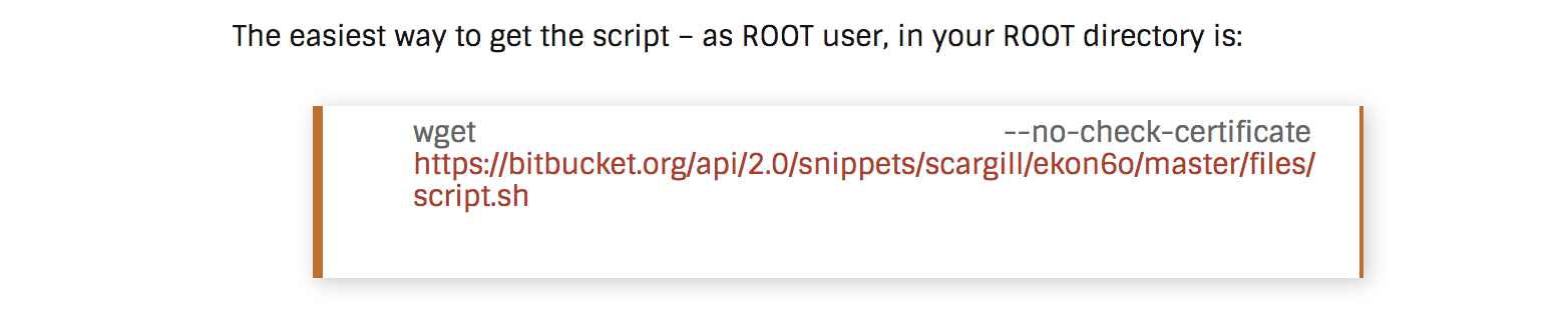 wget –no-check-certificate https://bitbucket.org/api/2.0/snippets/scargill/ekon6o/master/files/script.sh